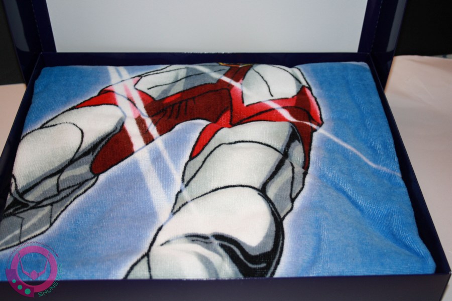 Al desenvolver la caja descubrimos que contiene una toalla de playa estratégicamente doblada para que al abrirla podemos ver a Seiya con el puño en alto, en ademán de lo que posiblemente sea el Pegasasu Ryu Sei Ken. También trae una tarjeta en perfecto japones donde podemos ver las instrucciones de lavado.
