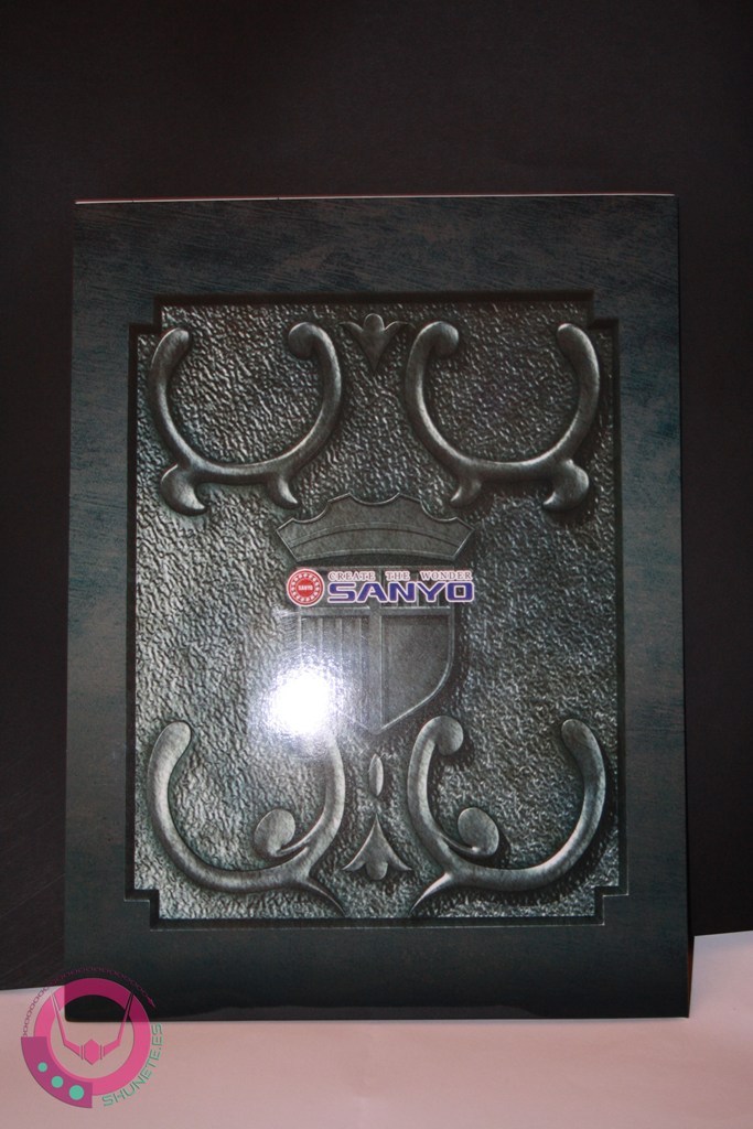 Al abrir el sobre encontramos un portafolios en cartunila rígida y acabado en brillo con una muy detallada y realista pandora de la armadura de Pegaso. Ambas caras están adornadas con los logotipos de Sanyo.