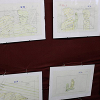 Una vez que salías de la vorágine de los dioramas la gente se daba cuenta de que había un montón de dibujos a lápices de la serie y comenzaban a verlos y a seguir la fila de láminas que recorrían las paredes de la exposición. Era muy normal ver a más de una persona parada delante de la secuencia de Seiya estrellándose contra el suelo o del douga del perfil de Hyoga y no faltaba el que no podía elegir cual era su favorito y tuvo que recurrir a fotografiar independientemente cada lámina para luego poder volver a disfrutarlos en su casa y decidirse.