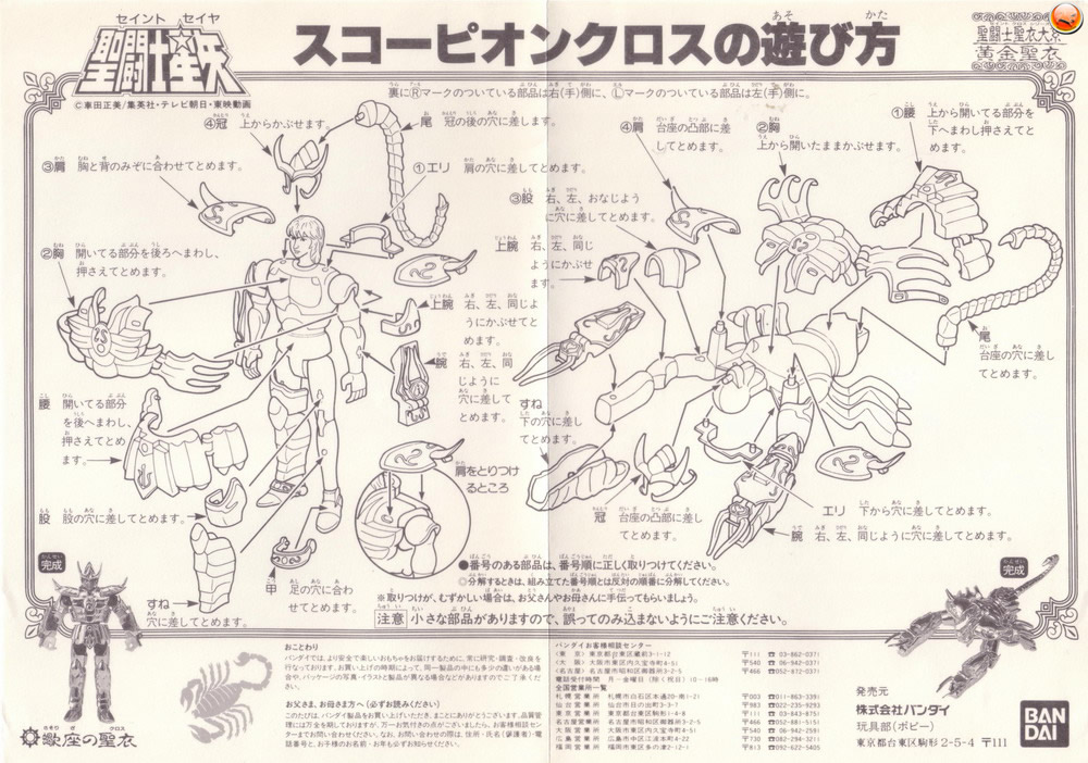 Las escenas recreadas en el reverso de la caja de este Gold Saint son uno de sus mayores tesoros. En ellas se nos muestran los prototipos de Milo de Escorpio y Aioria de Leo frente a la maqueta de Arles y que serviría de inspiración a Bandai para su próxima Present Campaing.
