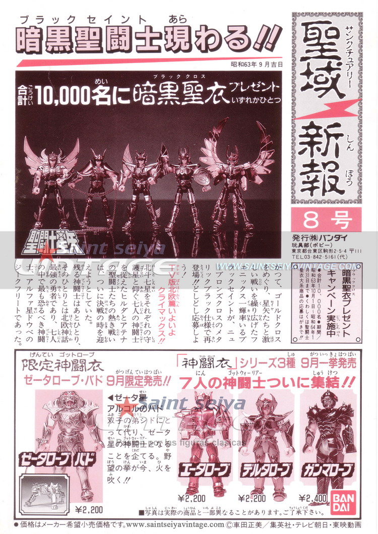 El octavo de estos Catálogos supone el anuncio de la V Campaña Promocional dedicada a los Black Saints New Version, en la cual diez mil de estas figuras serán sorteadas entre los afortunados fans. ¡10.000 Caballeros Negros en Total! lo cual nos lleva a suponer la edicion de dos mil unidades de cada Black Saint. El periodo de participación comprendería desde inicios de Octubre a finales de Enero de 1989.
